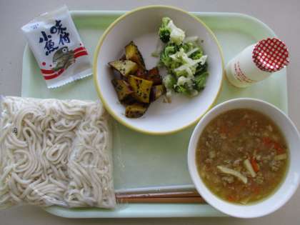 今日の献立は、ソフト麺の肉味噌かけ、大学芋、花野菜サラダ、味付け小魚、飲むヨーグルトです。