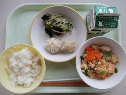 今日の献立は、いりどうふ、えびパオツ、きゅうりとわかめの酢の物、ご飯、牛乳です。