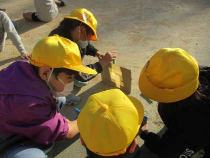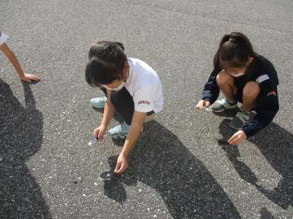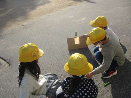 太陽の光を反射させたり集めたりして、あたたかさや明るさを調べました。鏡や虫眼鏡を使って真剣に実験していました。子供たちの様子です。