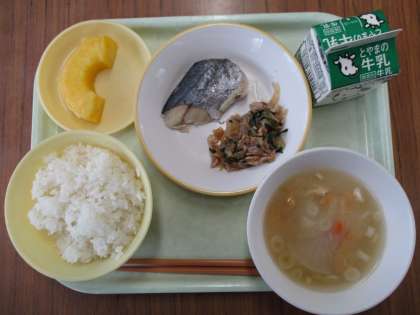 今日の献立は、しらたま汁、しらたきのピリ辛炒め、さわらの塩焼き、カットパイン、ご飯、牛乳です。