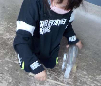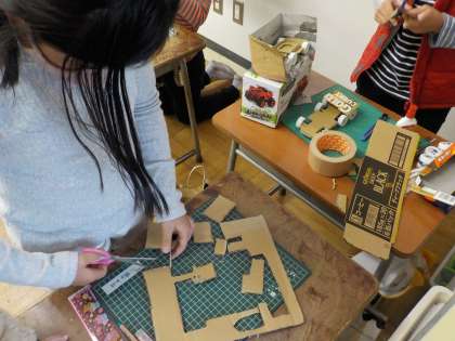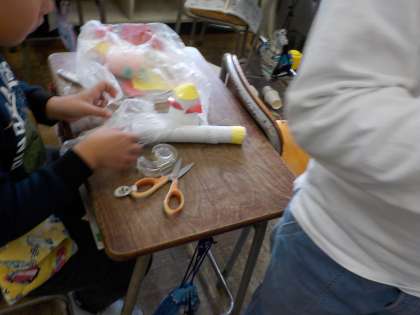 「車輪がうまく回らないよ。どうしたらいいんだろう?」「袋が破れてしまって遊べないよ。どうしたら丈夫にできるかな?」「細かいパーツが動きにも飾りにも大切なんだよね。」それぞれに工夫をしながらおもちゃ作りをしています。