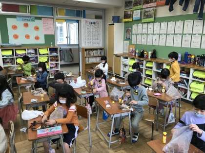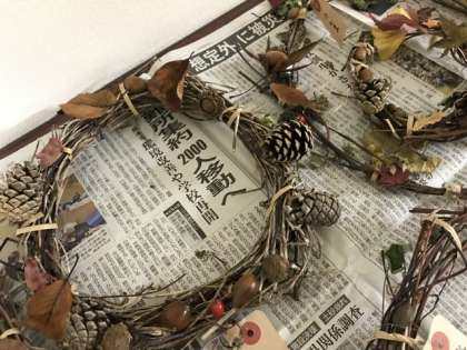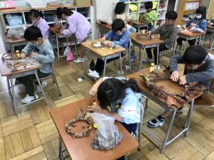 学校の周辺や公園で集めてきたどんぐりや落ち葉を使って、朝顔リースの飾り付けをしました。ボンドでしっかり付けようと、みんな真剣な様子でした。秋らしい彩りのすてきなリースになりました。