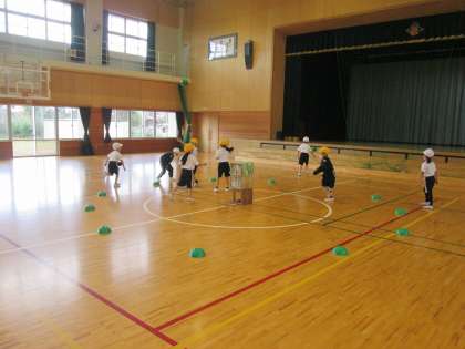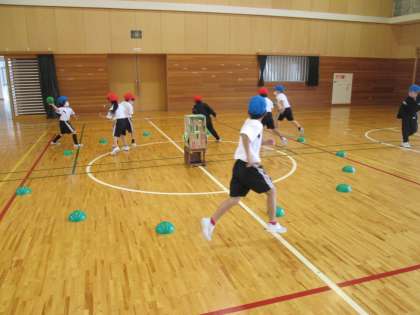 攻めと守りに分かれ、的を狙って投げたり的を守ったりしています。