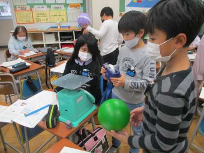 算数科の学習で、はかりを使用しました。量る際には、重さを予想しながら量りました。子供たちは予想と結果を比べながら「(予想と)近かった」「全然違った」など、結果に一喜一憂しながら楽しそうに活動していました。
