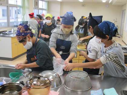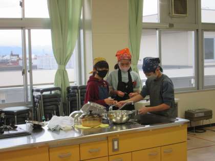 今日は、2組が調理実習を行いました。米が炊ける様子を見たり、煮干しから出汁をとってみそ汁をつくったりしました。初めての調理実習でしたが、子供たちは協力し合い、手際よく作業を進めていました。