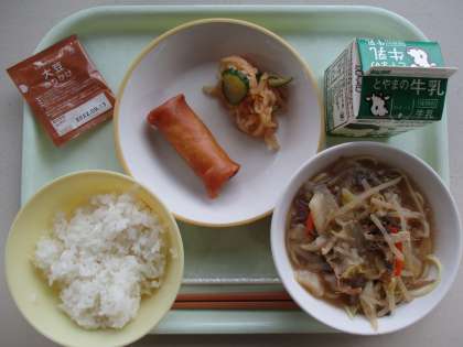 今日の献立は、豚骨ラーメン、はるまき、華風和え、大豆ふりかけ、ご飯、牛乳です。