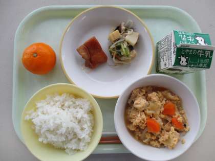 今日の献立は、照り焼きチキン、卵とじ、チンゲンサイソテー、ご飯、牛乳、みかんです。