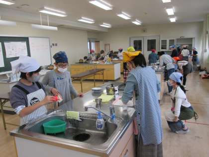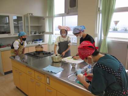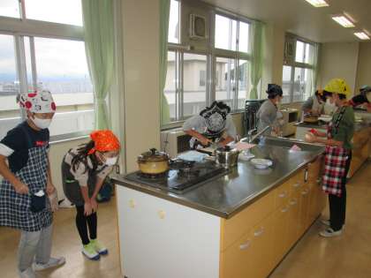 今日は、1組が調理実習を行いました。初めてでしたが、とても手際よく、班のみんなと協力してお米を炊いたりみそ汁をつくったりしました。