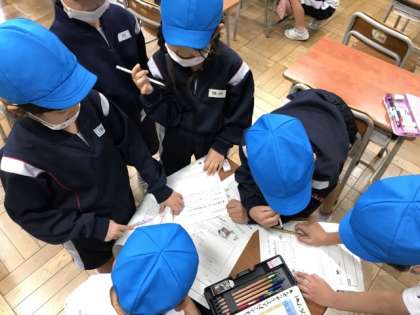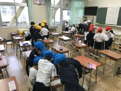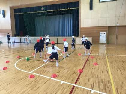 体育科、ボール投げゲームの様子です。チームで作戦を立て、攻め方、守り方を工夫して試合をしました。どのチームも応援に熱が入り、体育館に元気な声援が響いていました。