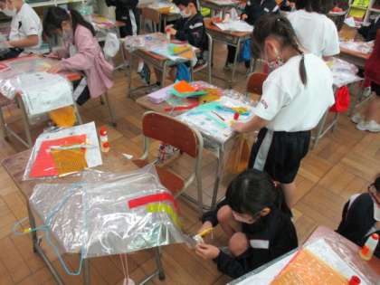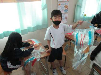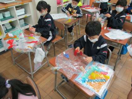図画工作科では、風にゆれると楽しい、きれいな飾りをつくっています。ハンガーに付けたビニル袋に、画用紙やセロハン、折り紙等で模様を貼っています。完成をお楽しみに!