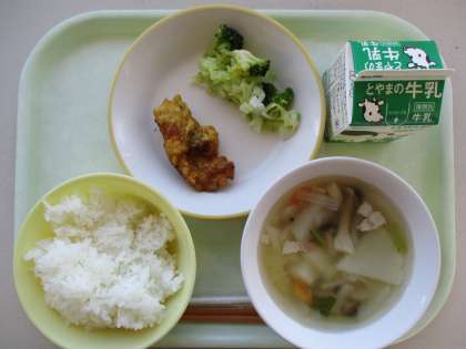 今日の献立は、ポークパコラ、添え野菜、かぶのスープ、ご飯、牛乳です。