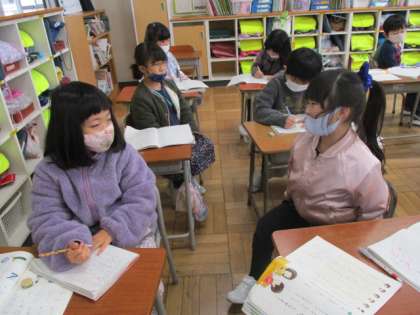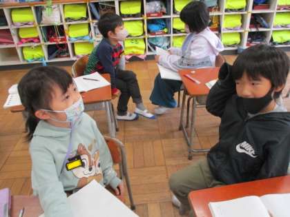 国語科「ともだちのことしらせよう」で、ペアの友達に今一番楽しいことをインタビューしました。子供たちはインタビューしたことを忘れないようにメモしたり、気になることをさらに質問したりしました。