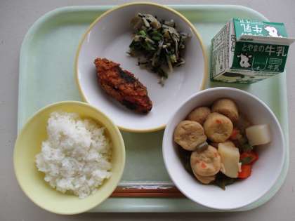 今日の献立は、魚の利休揚げ、磯和え、関東炊き、ご飯、牛乳です。