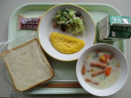 今日の献立は、オムレツ、クリーム煮、ビーンズサラダ、食パン、メープルジャム、牛乳です。