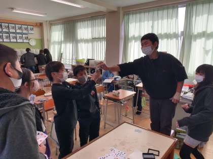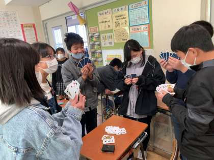 係活動のイベントで休み時間に「ばば抜き大会」をしています。おなじみのゲームですが、ものすごく盛り上がり、みんなの笑顔が広がっています。