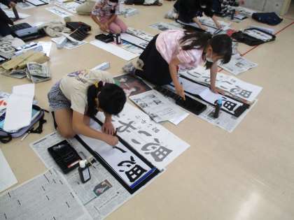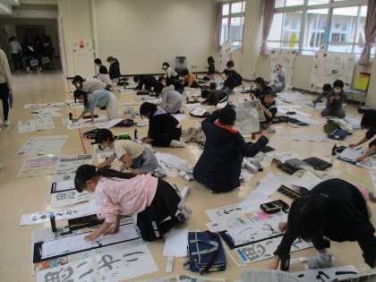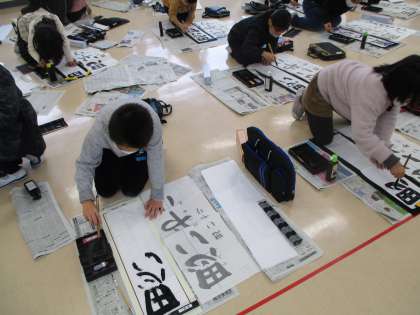 今日の書写の時間に、習字道具で初めての書き初め練習を行いました。3年生は「思いやり」という文字を書きます。今日はいつもより大きな用紙に書くため、いつもと違いプレイルームを使って準備し、広い場所で練習をしました。文字の大きさに気を付け、お手本を見ながらていねいに書こうとする子供の姿が見られました。