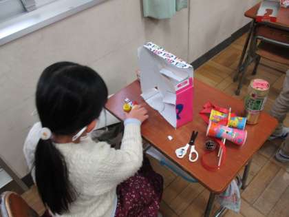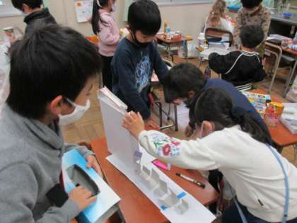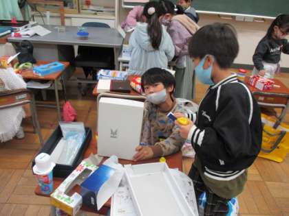 点数を付けたり仕掛けを考えたりして、遊ぶ人が楽しめるように工夫する姿がたくさん見られました。完成したら、他のクラスのみんなとも遊ぶ予定です。
