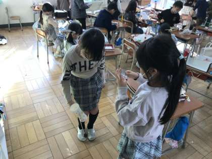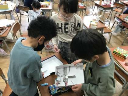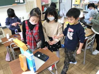 作ったおもちゃで友達と一緒に遊びながら、楽しく活動しています。友達のアイディアも参考にして、「次は何を作ろうかな?」とわくわくしている様子でした。