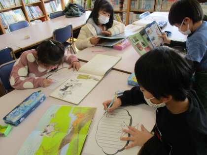 今日は、図書室で自分の好きな外国の昔話を選び、そのお話の登場人物や面白かったところお話カードにまとめました。みんな集中して取り組みました。