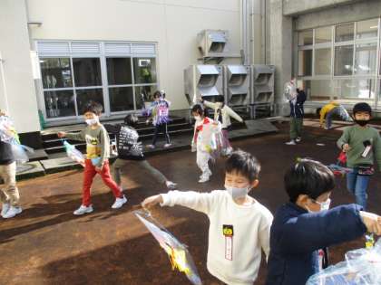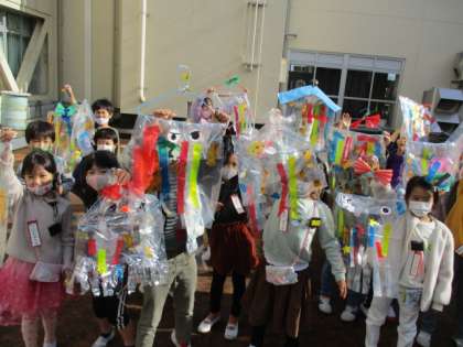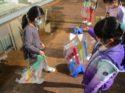 飾りをひらひらゆらしたり、太陽の光に当てたりして楽しみました。