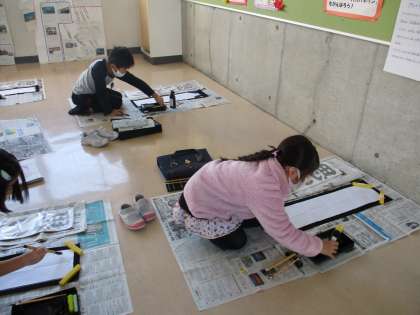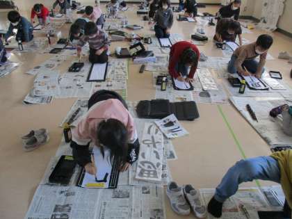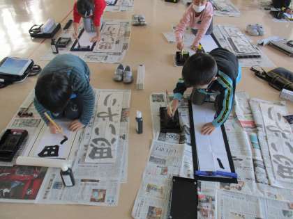書き初めの練習が始まりました。「思いやり」という字を手本を見ながら丁寧に書いています。子供たちの様子です。
