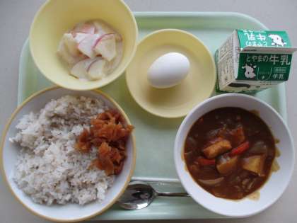 今日の献立は、麦ご飯のカレーライス、福神漬け、ゆでたまご、フルーツヨーグルト、牛乳です。