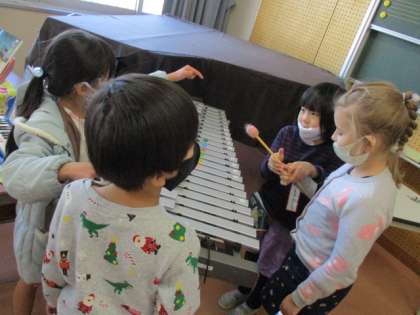今日は鉄琴に挑戦しました。グループで交代しながら、仲良く演奏しました。