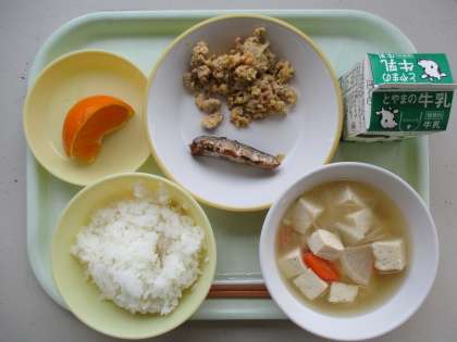今日の献立は、イワシの梅煮、卵とチンゲンサイの炒めもの、いものこ汁、ご飯、牛乳、あいかです。