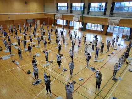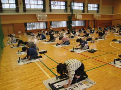 筆を持った子供たちは、心を落ち着かせて真剣な表情で一画ずつ丁寧に書き進めていました。学校や家庭での練習の成果を発揮し、子供たちは満足した様子でした。