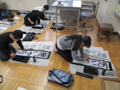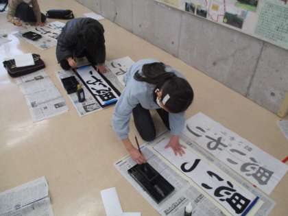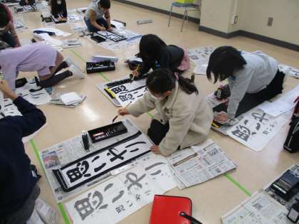 始業式後に書き初め大会が行われました。冬休み中の練習の成果を発揮しようと、子供たちは真剣に筆を握り、一画一画丁寧に書こうとする姿が見られました。
