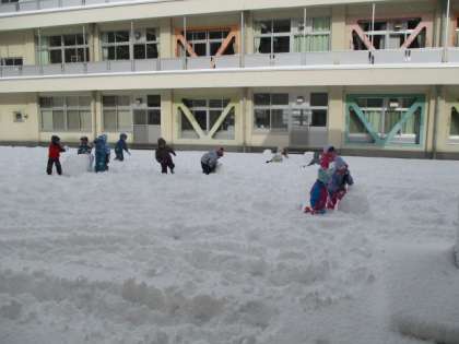 生活の時間に外に出て、雪遊びをしました。子供たちは友達と協力しながら、ゆきだるまやかまくらなどを作って楽しんでいました。