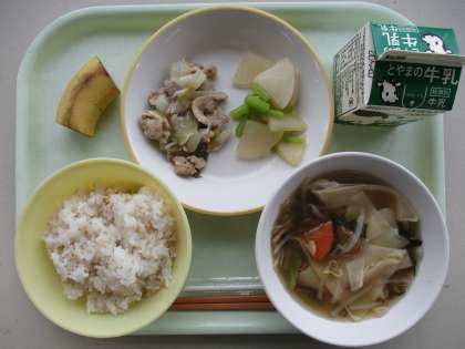 今日の献立は、塩だれ豚丼、かぶの色どり、ワンタンスープ、麦ごはん、バナナ、牛乳です。
