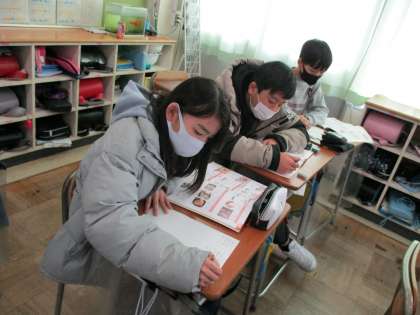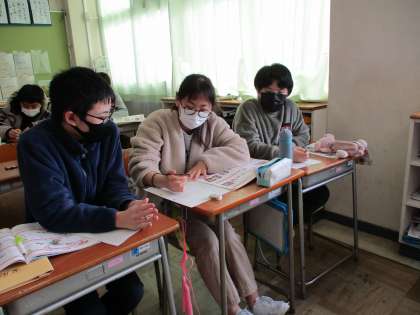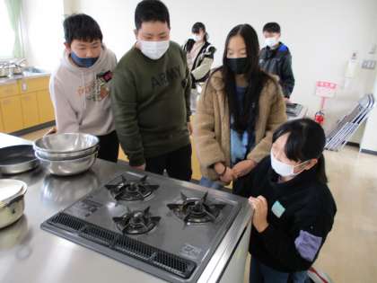 家庭科の学習で行う調理実習の計画を立てたり、調理器具の確認をしたりしています。グループで協力して「野菜のベーコン巻き」をつくります。