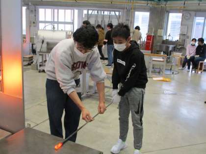 今日は1組が、富山ガラス工房で卒業記念制作として「ペーパーウエイト」を作りました。一人ずつガラス作家の方が付いてくださり、貴重な体験をさせていただくことができました。