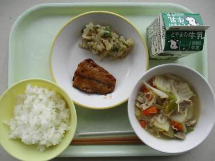 今日の献立は、はりはりソテー、さばの照り焼き、白菜なべ、ご飯、牛乳です。