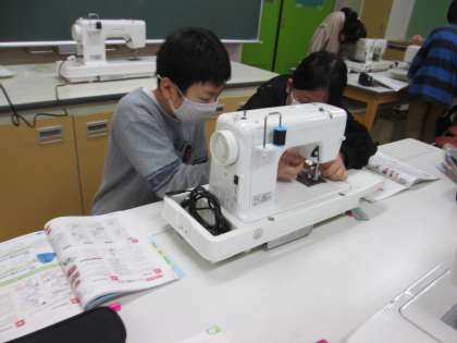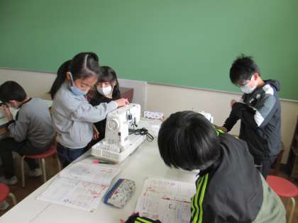 3学期の家庭科では、ミシンの使い方を学びます。ミシン各部の名前や基本的な動かし方を一生懸命覚えています。まずは練習布で練習してから、作品をつくりたいと思います。初めてミシンに触れる子供たちも多いですが、手際よくミシンを操作しています。