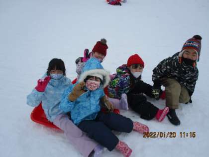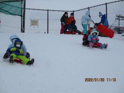 1人より、2人、3人で滑った方がスピードが出ることに気付いた子供たち。安全に気を付けて、みんなで仲良く滑っていました。