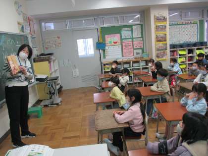 下の写真は、読み聞かせの様子です。子供たちは読み聞かせが好きです。お話の世界を楽しんでいました。