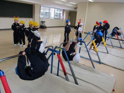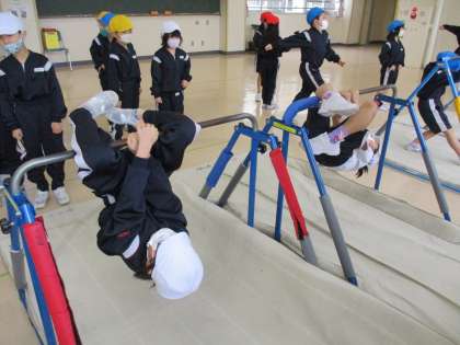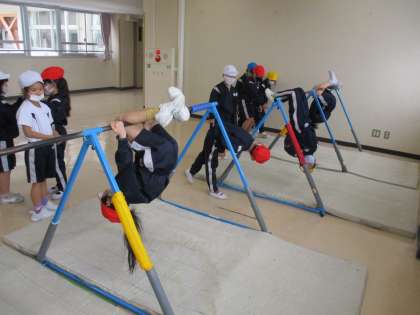室内に鉄棒が設置されたので、「ぶたのまるやき」や「こうもり」、「つばめ」等の技に挑戦しました。特に、ぶら下がり技の「ちきゅうまわり」に苦戦していた子供たちでしたが、練習を重ねるうちに少しずつできるようになってきました。2年生になっても引き続き、いろいろな技に挑戦していきます。