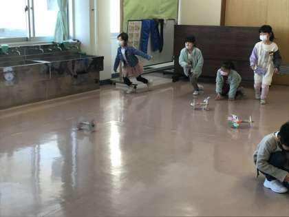 完成した作品を転がして遊びました。転がした時の、飾りの動きや模様の見え方の変化を楽しみました。