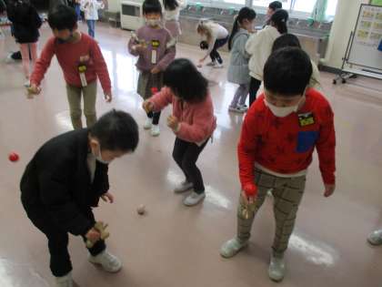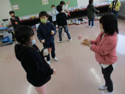 けん玉やお手玉、あやとり、めんこ等、いろいろな昔の遊びを知り、みんなで楽しみました。
