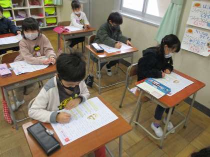 上の写真は、国語科のテストに取り組んでいる様子です。