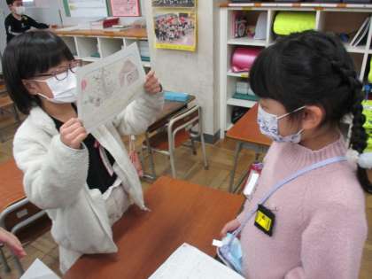 下の写真は、「たぬきの糸車」の好きな場面を視写し、紙芝居をつくって友達に紹介しているところです。友達がどんな場面を選んだのか、楽しそうに聞いていました。来週もいろいろな友達と紙芝居を紹介し合う予定です。