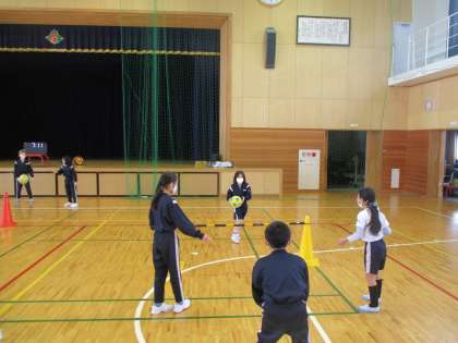 体育の学習でプレルボールを行っています。チームでボールを打ってつなぎ、相手コートに3回で返すことができるよう、練習を行っています。始めは動いているボールを正確に打つことがとても難しかったようですが、チームで練習を重ね、少しずつ慣れてきている様子が見られます。