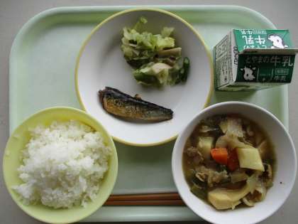 今日の献立は、イワシの土佐煮、野菜ソテー、豚肉とじゃがいものうま煮、ご飯、牛乳です。