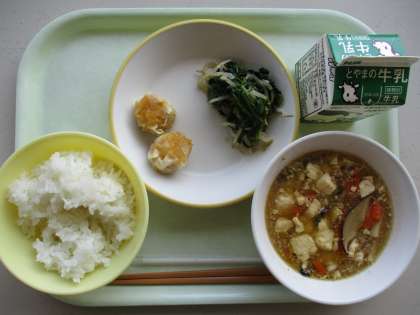 今日の献立は、にんじんシューマイ、おひたし、マーボーどうふ、ご飯、牛乳です。