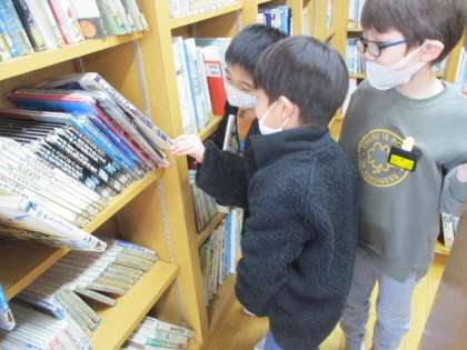 今日は、国語でお気に入りの本をみんなに紹介するために、図書室に行って本を選びました。みんなお気に入りの本がたくさんあったようで、悩みながら選んでいました。