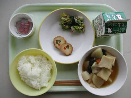 今日の献立は、野菜の肉巻き、ゆかり和え、ご飯、おでん、なっとう、牛乳です。