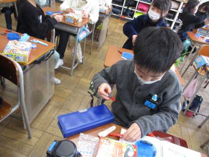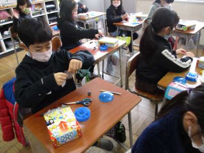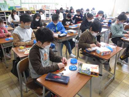 理科「磁石につけよう」の単元が始まりました。子供たちは、様々な物に磁石を近づけたり、物を間に挟んでくっつくのか試したりしていました。子供たちの様子です。