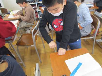 倍の計算の学習をしました。始めに「あた」「つか」といった昔の長さのはかり方を知り、実際に自分の手の「あた」と「つか」の長さを測定しました。その後、机の横の長さを「あた」と「つか」を使って調べ、その中から問題を作成し、みんなで解く活動を行いました。自分の「あた」と「つか」の長さを知り、興味津々で測量活動に取り組む子どもの姿が見られました。